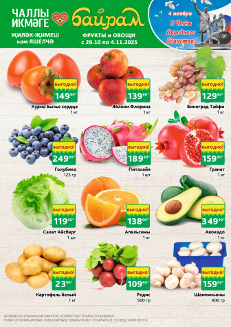 . Мы опубликовали акцию Фрукты и овощи, действие которой начинается 29 Октября и заканчивается 4 Ноября. Поэтому если Вы житель города Альметьевск либо же его гость, детальненько изучите данные предложения. Вполне возможно, здесь есть именно те скидки в супермаркетах, что Вы так давно и безутешно искали. Вооружитесь знаниями и вперед в ближайший к Вам магазин на шопинг! Только будьте бдительны и внимательно смотрите на дату, вдруг акция уже закончилась или еще не началась.