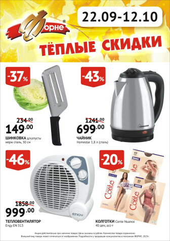 На текущей страничке можно найти просмотреть конкретные интересные предложения от супермаркетов ФОРНЕ . Мы опубликовали акцию Теплые скидки, действие которой начинается 22 Сентября и заканчивается 12 Октября. Поэтому если Вы житель города Бийск либо же его гость, детальненько изучите данные предложения. Вполне возможно, здесь есть именно те скидки в супермаркетах, что Вы так давно и безутешно искали. Вооружитесь знаниями и вперед в ближайший к Вам магазин на шопинг! Только будьте бдительны и внимательно смотрите на дату, вдруг акция уже закончилась или еще не началась.