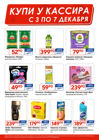 . Мы опубликовали акцию Купи у кассира, действие которой начинается 3 Декабря и заканчивается 7 Декабря. Поэтому если Вы житель города Иваново либо же его гость, детальненько изучите данные предложения. Вполне возможно, здесь есть именно те скидки в супермаркетах, что Вы так давно и безутешно искали. Вооружитесь знаниями и вперед в ближайший к Вам магазин на шопинг! Только будьте бдительны и внимательно смотрите на дату, вдруг акция уже закончилась или еще не началась.
