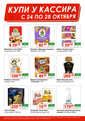 . Мы опубликовали акцию Купи у кассира, действие которой начинается 24 Октября и заканчивается 28 Октября. Поэтому если Вы житель города Иваново либо же его гость, детальненько изучите данные предложения. Вполне возможно, здесь есть именно те скидки в супермаркетах, что Вы так давно и безутешно искали. Вооружитесь знаниями и вперед в ближайший к Вам магазин на шопинг! Только будьте бдительны и внимательно смотрите на дату, вдруг акция уже закончилась или еще не началась.