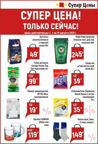 . Мы опубликовали акцию Новая неделя и новые товары по Супер цене!, действие которой начинается 4 Августа и заканчивается 10 Августа. Поэтому если Вы житель города Калининград либо же его гость, детальненько изучите данные предложения. Вполне возможно, здесь есть именно те скидки в супермаркетах, что Вы так давно и безутешно искали. Вооружитесь знаниями и вперед в ближайший к Вам магазин на шопинг! Только будьте бдительны и внимательно смотрите на дату, вдруг акция уже закончилась или еще не началась.