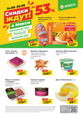 На текущей страничке можно найти просмотреть конкретные интересные предложения от гипермаркетов Макси гипермаркет . Мы опубликовали акцию Скидки ждут! (скидка предоставляется при наличии карты "Макси"), действие которой начинается 14 Августа и заканчивается 20 Августа. Поэтому если Вы житель города Киров либо же его гость, детальненько изучите данные предложения. Вполне возможно, здесь есть именно те скидки в супермаркетах, что Вы так давно и безутешно искали. Вооружитесь знаниями и вперед в ближайший к Вам магазин на шопинг! Только будьте бдительны и внимательно смотрите на дату, вдруг акция уже закончилась или еще не началась.