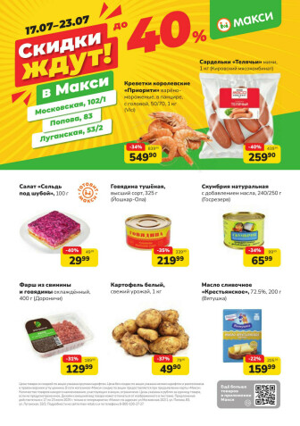 На текущей страничке можно найти просмотреть конкретные интересные предложения от гипермаркетов Макси гипермаркет . Мы опубликовали акцию Скидки ждут! (скидка предоставляется при наличии карты "Макси"), действие которой начинается 17 Июля и заканчивается 23 Июля. Поэтому если Вы житель города Киров либо же его гость, детальненько изучите данные предложения. Вполне возможно, здесь есть именно те скидки в супермаркетах, что Вы так давно и безутешно искали. Вооружитесь знаниями и вперед в ближайший к Вам магазин на шопинг! Только будьте бдительны и внимательно смотрите на дату, вдруг акция уже закончилась или еще не началась.