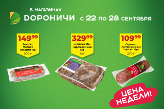 На текущей страничке можно найти просмотреть конкретные интересные предложения от супермаркетов Дороничи . Мы опубликовали акцию Цена недели, действие которой начинается 22 Сентября и заканчивается 28 Сентября. Поэтому если Вы житель города Кирово-Чепецк либо же его гость, детальненько изучите данные предложения. Вполне возможно, здесь есть именно те скидки в супермаркетах, что Вы так давно и безутешно искали. Вооружитесь знаниями и вперед в ближайший к Вам магазин на шопинг! Только будьте бдительны и внимательно смотрите на дату, вдруг акция уже закончилась или еще не началась.