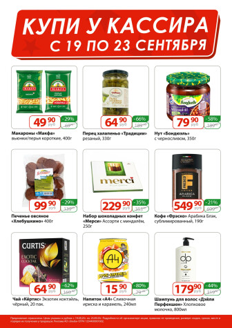 . Мы опубликовали акцию Купи у кассира, действие которой начинается 19 Сентября и заканчивается 23 Сентября. Поэтому если Вы житель города Кострома либо же его гость, детальненько изучите данные предложения. Вполне возможно, здесь есть именно те скидки в супермаркетах, что Вы так давно и безутешно искали. Вооружитесь знаниями и вперед в ближайший к Вам магазин на шопинг! Только будьте бдительны и внимательно смотрите на дату, вдруг акция уже закончилась или еще не началась.