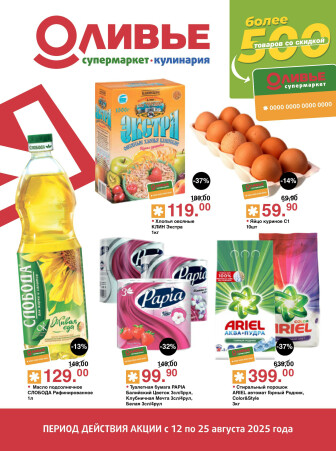 На текущей страничке можно найти просмотреть конкретные интересные предложения от супермаркетов Оливье . Мы опубликовали акцию Акционный каталог!, действие которой начинается 12 Августа и заканчивается 25 Августа. Поэтому если Вы житель города Москва либо же его гость, детальненько изучите данные предложения. Вполне возможно, здесь есть именно те скидки в супермаркетах, что Вы так давно и безутешно искали. Вооружитесь знаниями и вперед в ближайший к Вам магазин на шопинг! Только будьте бдительны и внимательно смотрите на дату, вдруг акция уже закончилась или еще не началась.