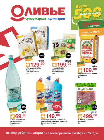 На текущей страничке можно найти просмотреть конкретные интересные предложения от супермаркетов Оливье . Мы опубликовали акцию Акционный каталог!, действие которой начинается 23 Сентября и заканчивается 6 Октября. Поэтому если Вы житель города Москва либо же его гость, детальненько изучите данные предложения. Вполне возможно, здесь есть именно те скидки в супермаркетах, что Вы так давно и безутешно искали. Вооружитесь знаниями и вперед в ближайший к Вам магазин на шопинг! Только будьте бдительны и внимательно смотрите на дату, вдруг акция уже закончилась или еще не началась.