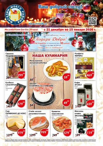 . Мы опубликовали акцию Акционная листовка, действие которой начинается 21 Декабря и заканчивается 15 Января. Поэтому если Вы житель города Пенза либо же его гость, детальненько изучите данные предложения. Вполне возможно, здесь есть именно те скидки в супермаркетах, что Вы так давно и безутешно искали. Вооружитесь знаниями и вперед в ближайший к Вам магазин на шопинг! Только будьте бдительны и внимательно смотрите на дату, вдруг акция уже закончилась или еще не началась.