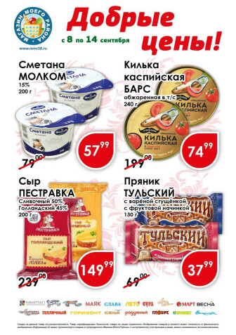 На текущей страничке можно найти просмотреть конкретные интересные предложения от супермаркетов Магазин Моего Района . Мы опубликовали акцию Добрые цены, действие которой начинается 8 Сентября и заканчивается 14 Сентября. Поэтому если Вы житель города Пенза либо же его гость, детальненько изучите данные предложения. Вполне возможно, здесь есть именно те скидки в супермаркетах, что Вы так давно и безутешно искали. Вооружитесь знаниями и вперед в ближайший к Вам магазин на шопинг! Только будьте бдительны и внимательно смотрите на дату, вдруг акция уже закончилась или еще не началась.