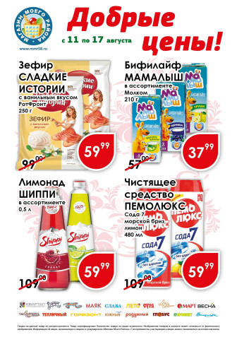 На текущей страничке можно найти просмотреть конкретные интересные предложения от супермаркетов Магазин Моего Района . Мы опубликовали акцию Добрые цены, действие которой начинается 11 Августа и заканчивается 17 Августа. Поэтому если Вы житель города Пенза либо же его гость, детальненько изучите данные предложения. Вполне возможно, здесь есть именно те скидки в супермаркетах, что Вы так давно и безутешно искали. Вооружитесь знаниями и вперед в ближайший к Вам магазин на шопинг! Только будьте бдительны и внимательно смотрите на дату, вдруг акция уже закончилась или еще не началась.