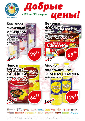 На текущей страничке можно найти просмотреть конкретные интересные предложения от супермаркетов Магазин Моего Района . Мы опубликовали акцию Добрые цены, действие которой начинается 25 Августа и заканчивается 31 Августа. Поэтому если Вы житель города Пенза либо же его гость, детальненько изучите данные предложения. Вполне возможно, здесь есть именно те скидки в супермаркетах, что Вы так давно и безутешно искали. Вооружитесь знаниями и вперед в ближайший к Вам магазин на шопинг! Только будьте бдительны и внимательно смотрите на дату, вдруг акция уже закончилась или еще не началась.