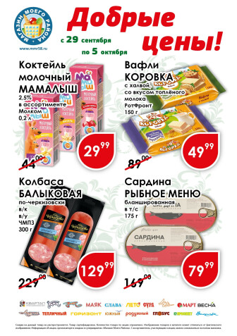 На текущей страничке можно найти просмотреть конкретные интересные предложения от супермаркетов Магазин Моего Района . Мы опубликовали акцию Добрые цены, действие которой начинается 29 Сентября и заканчивается 5 Октября. Поэтому если Вы житель города Пенза либо же его гость, детальненько изучите данные предложения. Вполне возможно, здесь есть именно те скидки в супермаркетах, что Вы так давно и безутешно искали. Вооружитесь знаниями и вперед в ближайший к Вам магазин на шопинг! Только будьте бдительны и внимательно смотрите на дату, вдруг акция уже закончилась или еще не началась.