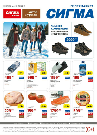 . Мы опубликовали акцию Каталог(цены действительны по картам Сигма-Лотос и социальным картам), действие которой начинается 10 Октября и заканчивается 23 Октября. Поэтому если Вы житель города Петрозаводск либо же его гость, детальненько изучите данные предложения. Вполне возможно, здесь есть именно те скидки в супермаркетах, что Вы так давно и безутешно искали. Вооружитесь знаниями и вперед в ближайший к Вам магазин на шопинг! Только будьте бдительны и внимательно смотрите на дату, вдруг акция уже закончилась или еще не началась.