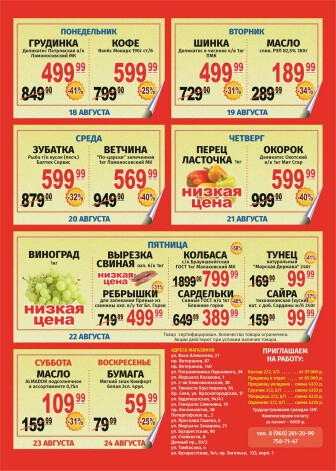 Если Вы здесь, значит, Вас интересуют скидки супермаркетов. Именно сайт Скидка Онлайн призван помочь Вам снизить ежедневные расходы и позволит быстренько найти акции всех супермаркетов. Мы тщательнейшим образом отыскали и собрали инфу про акции и скидки в магазинах. Суть заключается в том, чтобы Вы отправлялись совершать свои покупки, начиная от продуктов и заканчивая дорогостоящей бытовой техникой, по наиболее выгодным ценам.