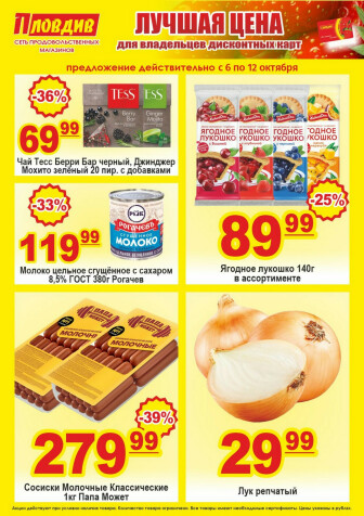 На текущей страничке можно найти просмотреть конкретные интересные предложения от супермаркетов Пловдив . Мы опубликовали акцию Лучшая цена, действие которой начинается 6 Октября и заканчивается 12 Октября. Поэтому если Вы житель города Санкт-Петербург либо же его гость, детальненько изучите данные предложения. Вполне возможно, здесь есть именно те скидки в супермаркетах, что Вы так давно и безутешно искали. Вооружитесь знаниями и вперед в ближайший к Вам магазин на шопинг! Только будьте бдительны и внимательно смотрите на дату, вдруг акция уже закончилась или еще не началась.