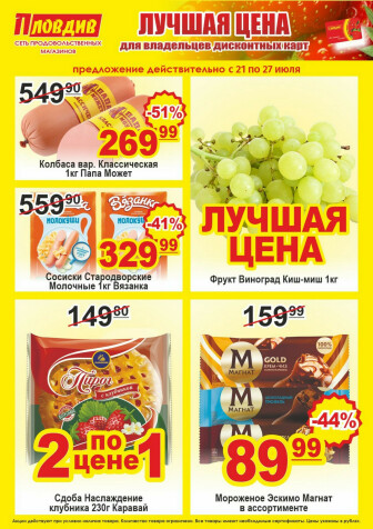 На текущей страничке можно найти просмотреть конкретные интересные предложения от супермаркетов Пловдив . Мы опубликовали акцию Лучшая цена, действие которой начинается 21 Июля и заканчивается 27 Июля. Поэтому если Вы житель города Санкт-Петербург либо же его гость, детальненько изучите данные предложения. Вполне возможно, здесь есть именно те скидки в супермаркетах, что Вы так давно и безутешно искали. Вооружитесь знаниями и вперед в ближайший к Вам магазин на шопинг! Только будьте бдительны и внимательно смотрите на дату, вдруг акция уже закончилась или еще не началась.