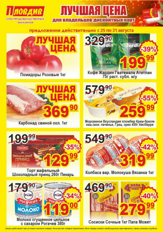 На текущей страничке можно найти просмотреть конкретные интересные предложения от супермаркетов Пловдив . Мы опубликовали акцию Лучшая цена, действие которой начинается 25 Августа и заканчивается 31 Августа. Поэтому если Вы житель города Санкт-Петербург либо же его гость, детальненько изучите данные предложения. Вполне возможно, здесь есть именно те скидки в супермаркетах, что Вы так давно и безутешно искали. Вооружитесь знаниями и вперед в ближайший к Вам магазин на шопинг! Только будьте бдительны и внимательно смотрите на дату, вдруг акция уже закончилась или еще не началась.