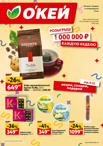 На текущей страничке можно найти просмотреть конкретные интересные предложения от супермаркетов Окей гипермаркет . Мы опубликовали акцию Каталог регулярных предложений, действие которой начинается 25 Сентября и заканчивается 8 Октября. Поэтому если Вы житель города Сочи либо же его гость, детальненько изучите данные предложения. Вполне возможно, здесь есть именно те скидки в супермаркетах, что Вы так давно и безутешно искали. Вооружитесь знаниями и вперед в ближайший к Вам магазин на шопинг! Только будьте бдительны и внимательно смотрите на дату, вдруг акция уже закончилась или еще не началась.