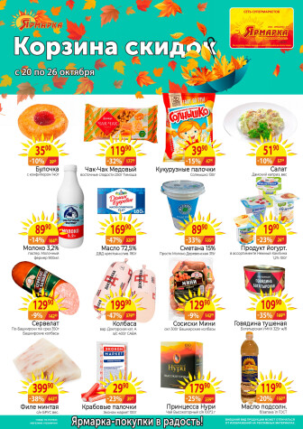 На текущей страничке можно найти просмотреть конкретные интересные предложения от супермаркетов Ярмарка . Мы опубликовали акцию Корзина скидок, действие которой начинается 20 Октября и заканчивается 26 Октября. Поэтому если Вы житель города Стерлитамак либо же его гость, детальненько изучите данные предложения. Вполне возможно, здесь есть именно те скидки в супермаркетах, что Вы так давно и безутешно искали. Вооружитесь знаниями и вперед в ближайший к Вам магазин на шопинг! Только будьте бдительны и внимательно смотрите на дату, вдруг акция уже закончилась или еще не началась.