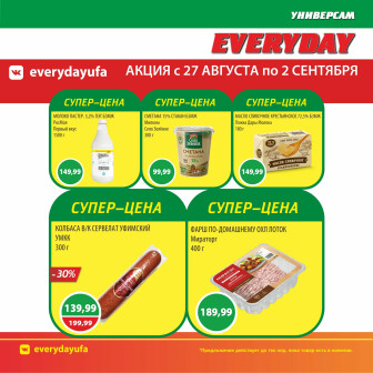 На текущей страничке можно найти просмотреть конкретные интересные предложения от супермаркетов Everyday . Мы опубликовали акцию Акционные предложения, действие которой начинается 27 Августа и заканчивается 2 Сентября. Поэтому если Вы житель города Уфа либо же его гость, детальненько изучите данные предложения. Вполне возможно, здесь есть именно те скидки в супермаркетах, что Вы так давно и безутешно искали. Вооружитесь знаниями и вперед в ближайший к Вам магазин на шопинг! Только будьте бдительны и внимательно смотрите на дату, вдруг акция уже закончилась или еще не началась.