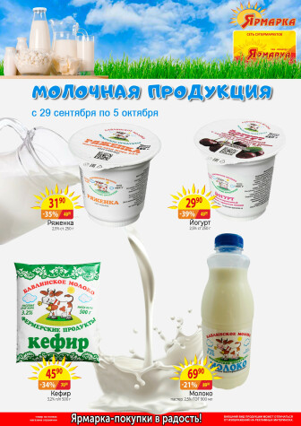 На текущей страничке можно найти просмотреть конкретные интересные предложения от супермаркетов Ярмарка . Мы опубликовали акцию Молочная продукция, действие которой начинается 29 Сентября и заканчивается 5 Октября. Поэтому если Вы житель города Уфа либо же его гость, детальненько изучите данные предложения. Вполне возможно, здесь есть именно те скидки в супермаркетах, что Вы так давно и безутешно искали. Вооружитесь знаниями и вперед в ближайший к Вам магазин на шопинг! Только будьте бдительны и внимательно смотрите на дату, вдруг акция уже закончилась или еще не началась.