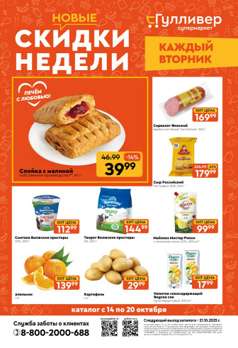 На текущей страничке можно найти просмотреть конкретные интересные предложения от супермаркетов Гулливер . Мы опубликовали акцию Скидки недели!, действие которой начинается 14 Октября и заканчивается 20 Октября. Поэтому если Вы житель города Ульяновск либо же его гость, детальненько изучите данные предложения. Вполне возможно, здесь есть именно те скидки в супермаркетах, что Вы так давно и безутешно искали. Вооружитесь знаниями и вперед в ближайший к Вам магазин на шопинг! Только будьте бдительны и внимательно смотрите на дату, вдруг акция уже закончилась или еще не началась.