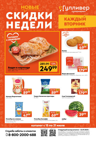 На текущей страничке можно найти просмотреть конкретные интересные предложения от супермаркетов Гулливер . Мы опубликовали акцию Скидки недели!, действие которой начинается 15 Июля и заканчивается 21 Июля. Поэтому если Вы житель города Ульяновск либо же его гость, детальненько изучите данные предложения. Вполне возможно, здесь есть именно те скидки в супермаркетах, что Вы так давно и безутешно искали. Вооружитесь знаниями и вперед в ближайший к Вам магазин на шопинг! Только будьте бдительны и внимательно смотрите на дату, вдруг акция уже закончилась или еще не началась.