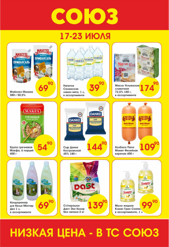 На текущей страничке можно найти просмотреть конкретные интересные предложения от супермаркетов СОЮЗ . Мы опубликовали акцию Просто низкие цены!, действие которой начинается 17 Июля и заканчивается 23 Июля. Поэтому если Вы житель города Вельск либо же его гость, детальненько изучите данные предложения. Вполне возможно, здесь есть именно те скидки в супермаркетах, что Вы так давно и безутешно искали. Вооружитесь знаниями и вперед в ближайший к Вам магазин на шопинг! Только будьте бдительны и внимательно смотрите на дату, вдруг акция уже закончилась или еще не началась.