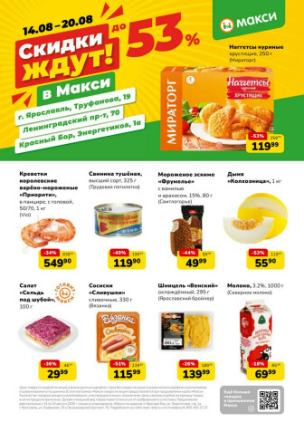 . Мы опубликовали акцию Скидки ждут! (скидка предоставляется при наличии карты "Макси"), действие которой начинается 14 Августа и заканчивается 20 Августа. Поэтому если Вы житель города Ярославль либо же его гость, детальненько изучите данные предложения. Вполне возможно, здесь есть именно те скидки в супермаркетах, что Вы так давно и безутешно искали. Вооружитесь знаниями и вперед в ближайший к Вам магазин на шопинг! Только будьте бдительны и внимательно смотрите на дату, вдруг акция уже закончилась или еще не началась.