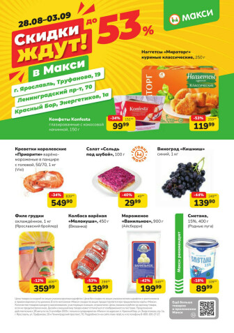 . Мы опубликовали акцию Скидки ждут! (скидка предоставляется при наличии карты "Макси"), действие которой начинается 28 Августа и заканчивается 3 Сентября. Поэтому если Вы житель города Ярославль либо же его гость, детальненько изучите данные предложения. Вполне возможно, здесь есть именно те скидки в супермаркетах, что Вы так давно и безутешно искали. Вооружитесь знаниями и вперед в ближайший к Вам магазин на шопинг! Только будьте бдительны и внимательно смотрите на дату, вдруг акция уже закончилась или еще не началась.