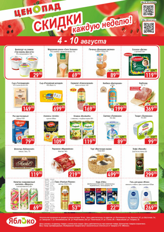 На текущей страничке можно найти просмотреть конкретные интересные предложения от супермаркетов Яблоко . Мы опубликовали акцию Ценопад, действие которой начинается 4 Августа и заканчивается 10 Августа. Поэтому если Вы житель города Екатеринбург либо же его гость, детальненько изучите данные предложения. Вполне возможно, здесь есть именно те скидки в супермаркетах, что Вы так давно и безутешно искали. Вооружитесь знаниями и вперед в ближайший к Вам магазин на шопинг! Только будьте бдительны и внимательно смотрите на дату, вдруг акция уже закончилась или еще не началась.