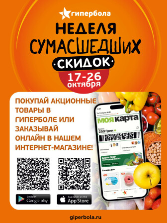 На текущей страничке можно найти просмотреть конкретные интересные предложения от супермаркетов Гипербола . Мы опубликовали акцию Неделя сумасшедших скидок, действие которой начинается 17 Октября и заканчивается 26 Октября. Поэтому если Вы житель города Екатеринбург либо же его гость, детальненько изучите данные предложения. Вполне возможно, здесь есть именно те скидки в супермаркетах, что Вы так давно и безутешно искали. Вооружитесь знаниями и вперед в ближайший к Вам магазин на шопинг! Только будьте бдительны и внимательно смотрите на дату, вдруг акция уже закончилась или еще не началась.
