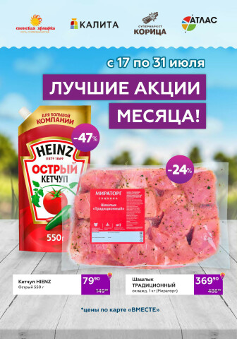 . Мы опубликовали акцию Акционный каталог (цены действительны по карте "ВМЕСТЕКАРД"), действие которой начинается 17 Июля и заканчивается 31 Июля. Поэтому если Вы житель города Брянск либо же его гость, детальненько изучите данные предложения. Вполне возможно, здесь есть именно те скидки в супермаркетах, что Вы так давно и безутешно искали. Вооружитесь знаниями и вперед в ближайший к Вам магазин на шопинг! Только будьте бдительны и внимательно смотрите на дату, вдруг акция уже закончилась или еще не началась.