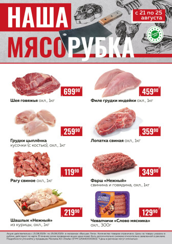 . Мы опубликовали акцию Наша мясорубка, действие которой начинается 21 Августа и заканчивается 25 Августа. Поэтому если Вы житель города Георгиевское либо же его гость, детальненько изучите данные предложения. Вполне возможно, здесь есть именно те скидки в супермаркетах, что Вы так давно и безутешно искали. Вооружитесь знаниями и вперед в ближайший к Вам магазин на шопинг! Только будьте бдительны и внимательно смотрите на дату, вдруг акция уже закончилась или еще не началась.