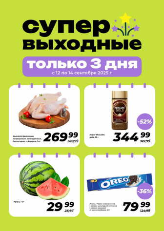 . Мы опубликовали акцию Супер выходные!, действие которой начинается 12 Сентября и заканчивается 14 Сентября. Поэтому если Вы житель города Иркутск либо же его гость, детальненько изучите данные предложения. Вполне возможно, здесь есть именно те скидки в супермаркетах, что Вы так давно и безутешно искали. Вооружитесь знаниями и вперед в ближайший к Вам магазин на шопинг! Только будьте бдительны и внимательно смотрите на дату, вдруг акция уже закончилась или еще не началась.