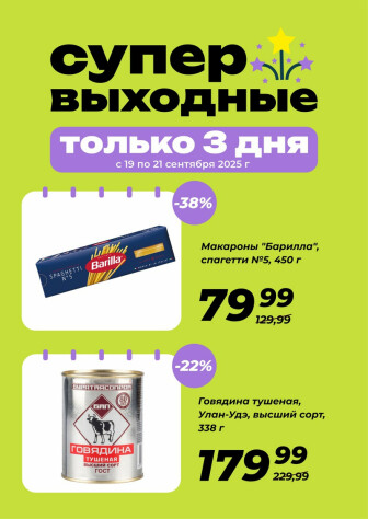 . Мы опубликовали акцию Супер выходные!, действие которой начинается 19 Сентября и заканчивается 21 Сентября. Поэтому если Вы житель города Иркутск либо же его гость, детальненько изучите данные предложения. Вполне возможно, здесь есть именно те скидки в супермаркетах, что Вы так давно и безутешно искали. Вооружитесь знаниями и вперед в ближайший к Вам магазин на шопинг! Только будьте бдительны и внимательно смотрите на дату, вдруг акция уже закончилась или еще не началась.