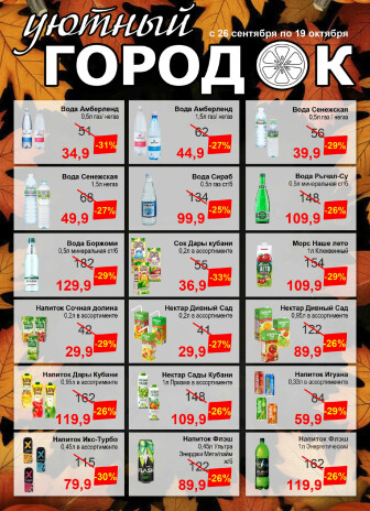 . Мы опубликовали акцию Акции, действие которой начинается 26 Сентября и заканчивается 19 Октября. Поэтому если Вы житель города Калининград либо же его гость, детальненько изучите данные предложения. Вполне возможно, здесь есть именно те скидки в супермаркетах, что Вы так давно и безутешно искали. Вооружитесь знаниями и вперед в ближайший к Вам магазин на шопинг! Только будьте бдительны и внимательно смотрите на дату, вдруг акция уже закончилась или еще не началась.