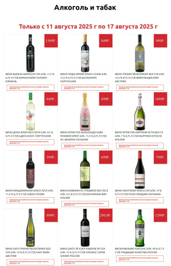 . Мы опубликовали акцию Алкоголь, действие которой начинается 11 Августа и заканчивается 17 Августа. Поэтому если Вы житель города Калининград либо же его гость, детальненько изучите данные предложения. Вполне возможно, здесь есть именно те скидки в супермаркетах, что Вы так давно и безутешно искали. Вооружитесь знаниями и вперед в ближайший к Вам магазин на шопинг! Только будьте бдительны и внимательно смотрите на дату, вдруг акция уже закончилась или еще не началась.
