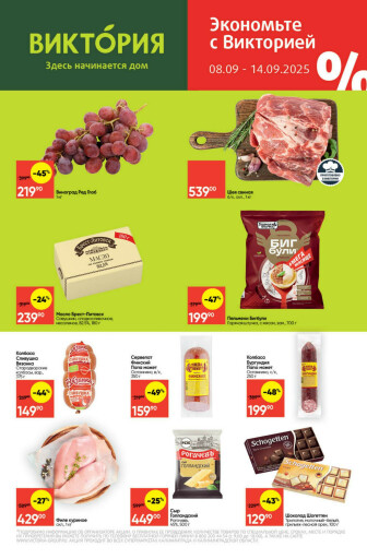 . Мы опубликовали акцию Экономьте с Викторией, действие которой начинается 8 Сентября и заканчивается 14 Сентября. Поэтому если Вы житель города Калининград либо же его гость, детальненько изучите данные предложения. Вполне возможно, здесь есть именно те скидки в супермаркетах, что Вы так давно и безутешно искали. Вооружитесь знаниями и вперед в ближайший к Вам магазин на шопинг! Только будьте бдительны и внимательно смотрите на дату, вдруг акция уже закончилась или еще не началась.