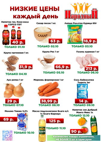 . Мы опубликовали акцию Товары дня ( Не все магазины) , действие которой начинается 1 Октября и заканчивается 12 Октября. Поэтому если Вы житель города Хомутово либо же его гость, детальненько изучите данные предложения. Вполне возможно, здесь есть именно те скидки в супермаркетах, что Вы так давно и безутешно искали. Вооружитесь знаниями и вперед в ближайший к Вам магазин на шопинг! Только будьте бдительны и внимательно смотрите на дату, вдруг акция уже закончилась или еще не началась.