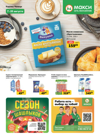 . Мы опубликовали акцию Каталог (скидка предоставляется при наличии карты "Макси"), действие которой начинается 7 Августа и заканчивается 20 Августа. Поэтому если Вы житель города Кирово-Чепецк либо же его гость, детальненько изучите данные предложения. Вполне возможно, здесь есть именно те скидки в супермаркетах, что Вы так давно и безутешно искали. Вооружитесь знаниями и вперед в ближайший к Вам магазин на шопинг! Только будьте бдительны и внимательно смотрите на дату, вдруг акция уже закончилась или еще не началась.