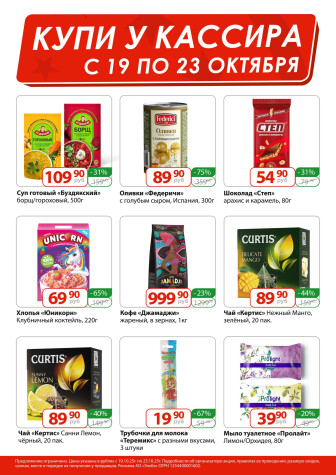 . Мы опубликовали акцию Купи у кассира, действие которой начинается 19 Октября и заканчивается 23 Октября. Поэтому если Вы житель города Кострома либо же его гость, детальненько изучите данные предложения. Вполне возможно, здесь есть именно те скидки в супермаркетах, что Вы так давно и безутешно искали. Вооружитесь знаниями и вперед в ближайший к Вам магазин на шопинг! Только будьте бдительны и внимательно смотрите на дату, вдруг акция уже закончилась или еще не началась.
