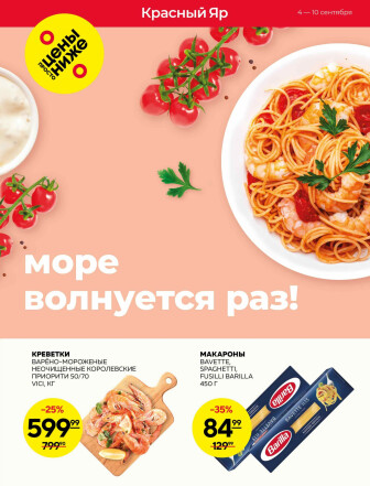 . Мы опубликовали акцию Каталог, действие которой начинается 4 Сентября и заканчивается 10 Сентября. Поэтому если Вы житель города Красноярск либо же его гость, детальненько изучите данные предложения. Вполне возможно, здесь есть именно те скидки в супермаркетах, что Вы так давно и безутешно искали. Вооружитесь знаниями и вперед в ближайший к Вам магазин на шопинг! Только будьте бдительны и внимательно смотрите на дату, вдруг акция уже закончилась или еще не началась.