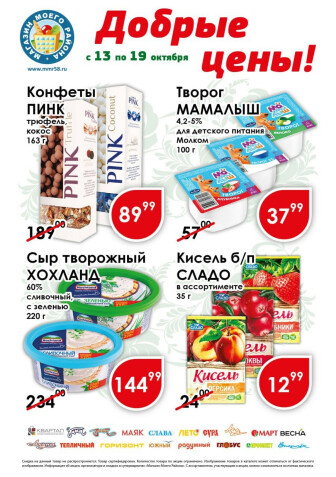 . Мы опубликовали акцию Добрые цены, действие которой начинается 13 Октября и заканчивается 19 Октября. Поэтому если Вы житель города Пенза либо же его гость, детальненько изучите данные предложения. Вполне возможно, здесь есть именно те скидки в супермаркетах, что Вы так давно и безутешно искали. Вооружитесь знаниями и вперед в ближайший к Вам магазин на шопинг! Только будьте бдительны и внимательно смотрите на дату, вдруг акция уже закончилась или еще не началась.