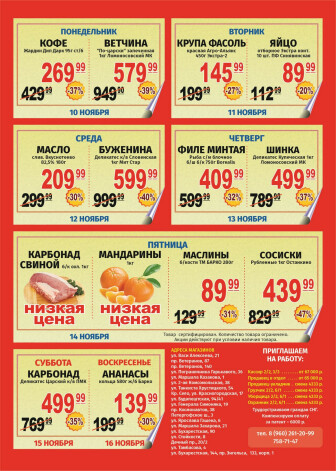 . Мы опубликовали акцию Акция, действие которой начинается 10 Ноября и заканчивается 16 Ноября. Поэтому если Вы житель города Санкт-Петербург либо же его гость, детальненько изучите данные предложения. Вполне возможно, здесь есть именно те скидки в супермаркетах, что Вы так давно и безутешно искали. Вооружитесь знаниями и вперед в ближайший к Вам магазин на шопинг! Только будьте бдительны и внимательно смотрите на дату, вдруг акция уже закончилась или еще не началась.