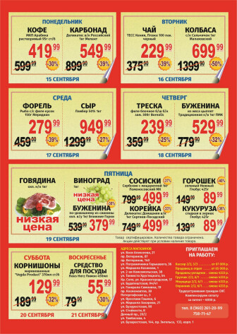 . Мы опубликовали акцию Акция, действие которой начинается 15 Сентября и заканчивается 21 Сентября. Поэтому если Вы житель города Санкт-Петербург либо же его гость, детальненько изучите данные предложения. Вполне возможно, здесь есть именно те скидки в супермаркетах, что Вы так давно и безутешно искали. Вооружитесь знаниями и вперед в ближайший к Вам магазин на шопинг! Только будьте бдительны и внимательно смотрите на дату, вдруг акция уже закончилась или еще не началась.
