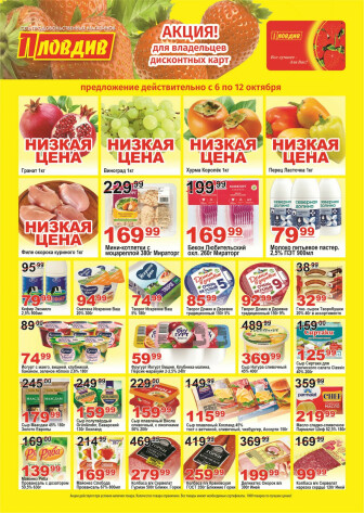. Мы опубликовали акцию Для владельцев дисконтных карт, действие которой начинается 6 Октября и заканчивается 12 Октября. Поэтому если Вы житель города Санкт-Петербург либо же его гость, детальненько изучите данные предложения. Вполне возможно, здесь есть именно те скидки в супермаркетах, что Вы так давно и безутешно искали. Вооружитесь знаниями и вперед в ближайший к Вам магазин на шопинг! Только будьте бдительны и внимательно смотрите на дату, вдруг акция уже закончилась или еще не началась.