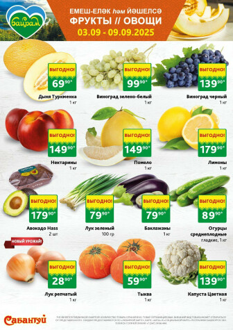 . Мы опубликовали акцию Фрукты и овощи!, действие которой начинается 3 Сентября и заканчивается 9 Сентября. Поэтому если Вы житель города Уфа либо же его гость, детальненько изучите данные предложения. Вполне возможно, здесь есть именно те скидки в супермаркетах, что Вы так давно и безутешно искали. Вооружитесь знаниями и вперед в ближайший к Вам магазин на шопинг! Только будьте бдительны и внимательно смотрите на дату, вдруг акция уже закончилась или еще не началась.