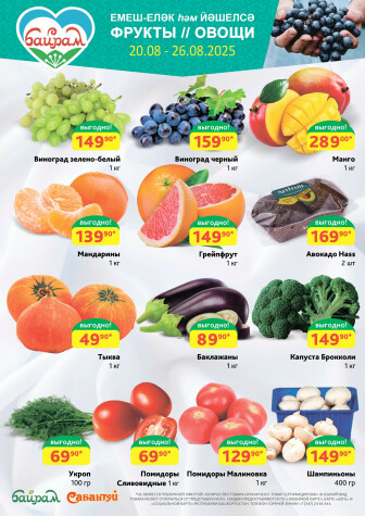 . Мы опубликовали акцию Фрукты и овощи!, действие которой начинается 20 Августа и заканчивается 26 Августа. Поэтому если Вы житель города Уфа либо же его гость, детальненько изучите данные предложения. Вполне возможно, здесь есть именно те скидки в супермаркетах, что Вы так давно и безутешно искали. Вооружитесь знаниями и вперед в ближайший к Вам магазин на шопинг! Только будьте бдительны и внимательно смотрите на дату, вдруг акция уже закончилась или еще не началась.