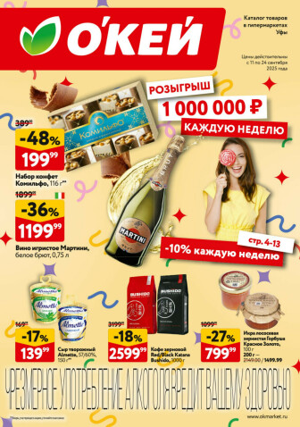 . Мы опубликовали акцию Каталог регулярных предложений, действие которой начинается 11 Сентября и заканчивается 24 Сентября. Поэтому если Вы житель города Уфа либо же его гость, детальненько изучите данные предложения. Вполне возможно, здесь есть именно те скидки в супермаркетах, что Вы так давно и безутешно искали. Вооружитесь знаниями и вперед в ближайший к Вам магазин на шопинг! Только будьте бдительны и внимательно смотрите на дату, вдруг акция уже закончилась или еще не началась.